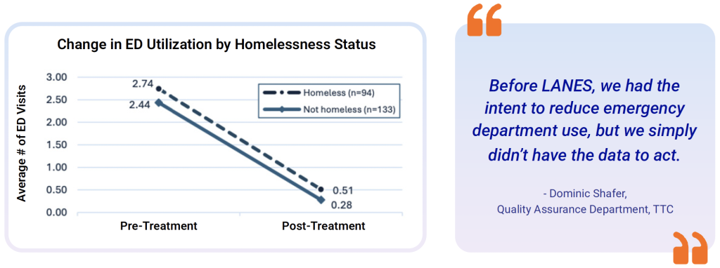 By integrating clinical and social data from multiple systems, LANES enabled TTC to accurately track patient outcomes. The findings revealed that patients that went through TTC’s inpatient SUD programs experienced a dramatic decline in unnecessary ED visits post-treatment. On average, visits declined from 2.6 to 0.4 in those six months after treatment.